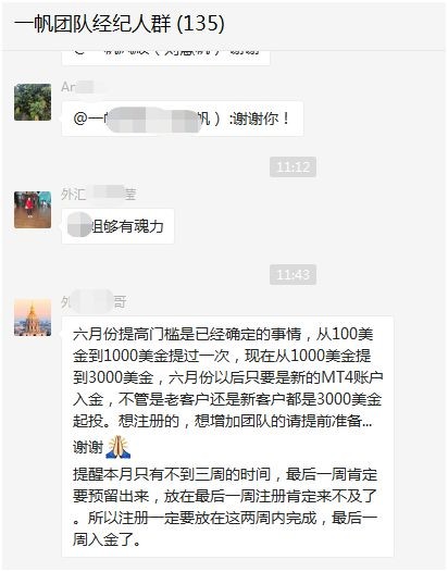据不完全统计,记者所在群的管理员负责的微信群已经多达69个,一个群满员为500人。记者从PTFX普顿外汇的其中一个团队“一帆团队经纪人群”发现,该团队中的经纪人数达到135人。一名管理员在群中告知所有经纪人“六月份”提高MT4账户的入金门槛至3000美元。也就是说,资金池规模将进一步扩大。