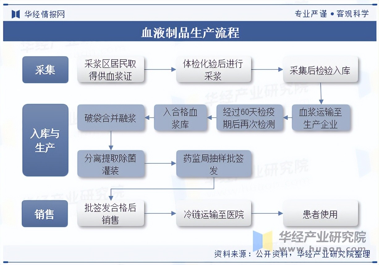 在我国,用于生产血制品的原料血浆都是通过依法设立的单采血浆站进行采集。单采血浆站由省级卫计委审批开设,由血制品企业负责管理,是血制品企业的独家资源。单采血浆站必须使用单采血浆机械采集,分离血浆后将红细胞、血小板、白细胞输回体内,采集的血浆经过三次病毒检疫后即可投产。血浆蛋白经过粗分离(低温乙醇法+离心/压滤工艺)和精纯化(层析技术)后,得到各种血制品。国内血制品采用批签发制,每批产品在企业自检合格后,提交批签发申请,在药监局审批合格后才可上市销售。