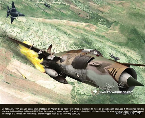 巴基斯坦战斗机在霍斯特地区的活动在1987年春季保持高水平。巴基斯坦的来源提到3月到4月期间发生了多起拦截事件,但认为只有一次是成功的。1987年4月16日,来自第14中队的两架F-16,由小队长巴达尔·乌斯·伊斯兰和哈立德·佩尔瓦兹·马尔瓦特驾驶,发现并拦截了四架阿富汗的苏-22。巴基斯坦飞行员从太阳方向接近目标,并在约10公里的距离上视觉上发现敌机。F-16攻击了其中一对“苏-22”。巴达尔·乌斯·伊斯兰回忆道: