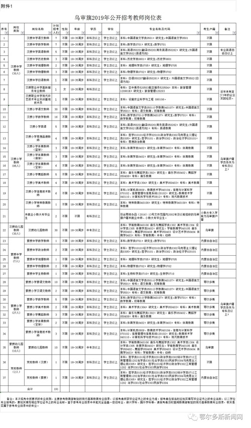 乌审旗2019年公开招考教师岗位表