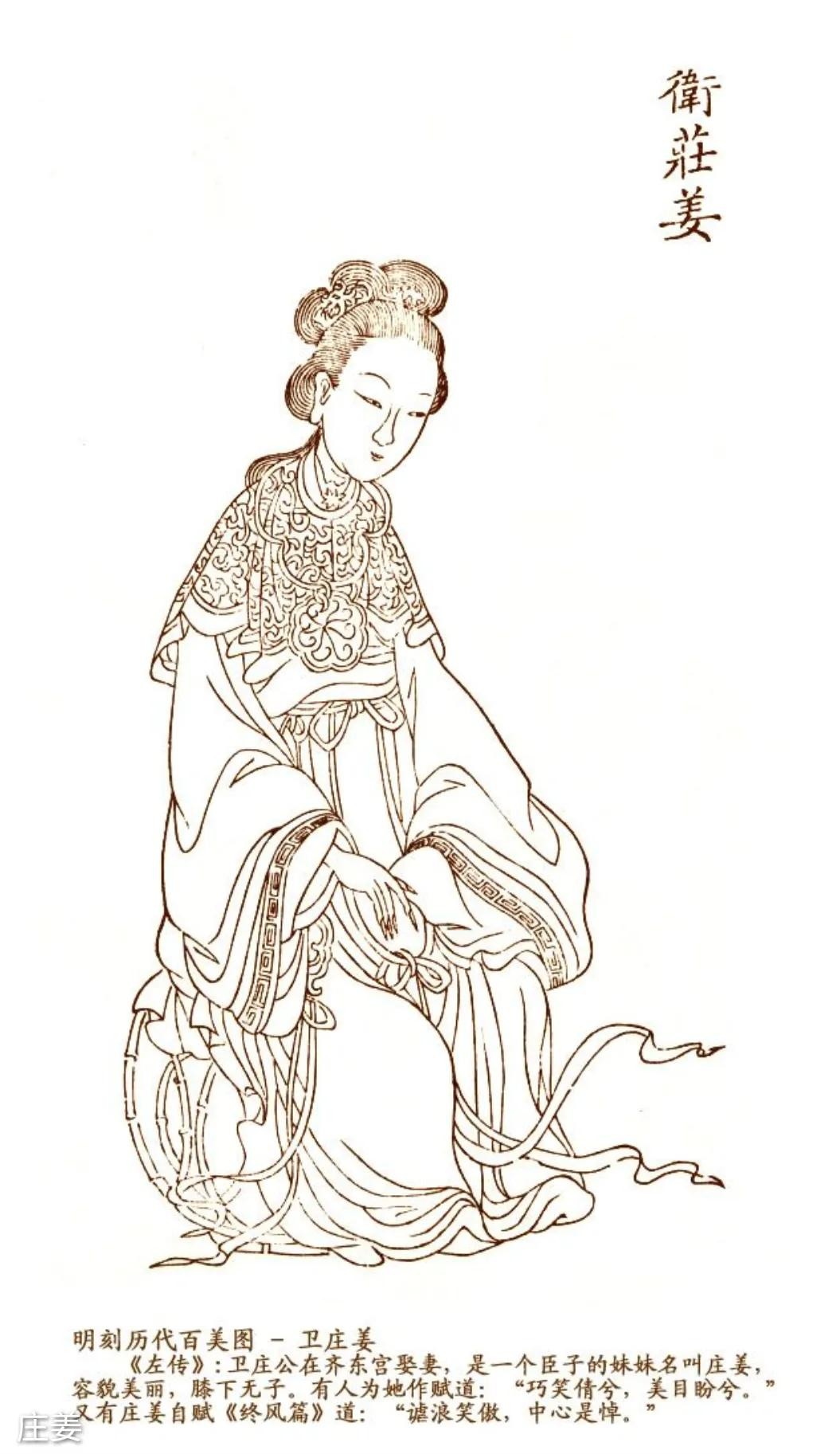 《诗经·卫风·硕人》就是卫国民众为赞美庄姜的美貌而作。主要描写了卫庄公夫人庄姜初嫁到卫国时的情景。描写她的诗句在后世也成为了美人的标杆。