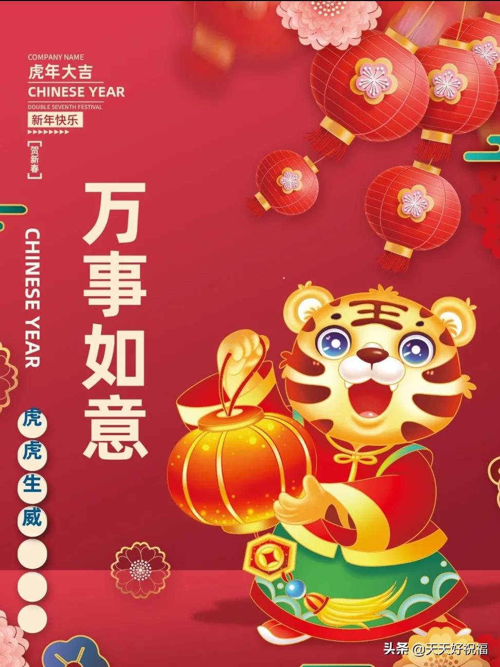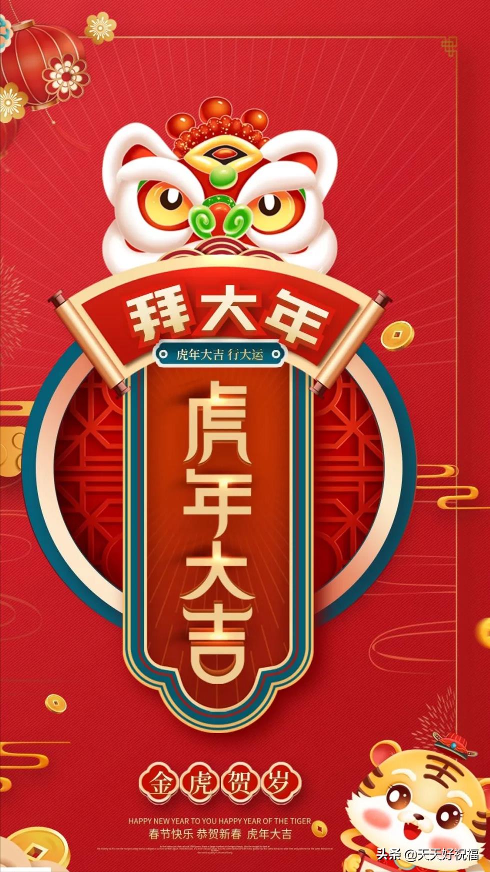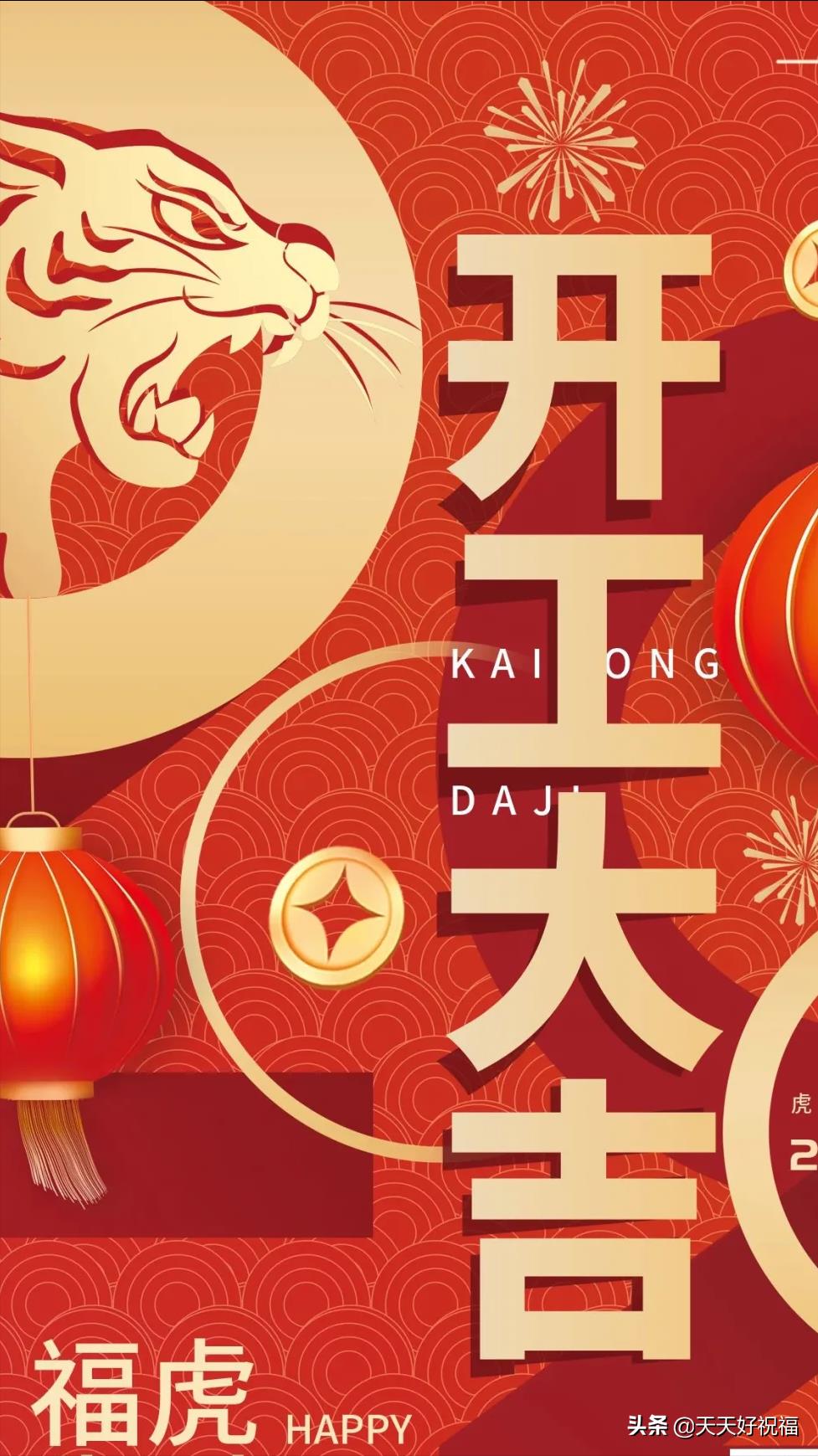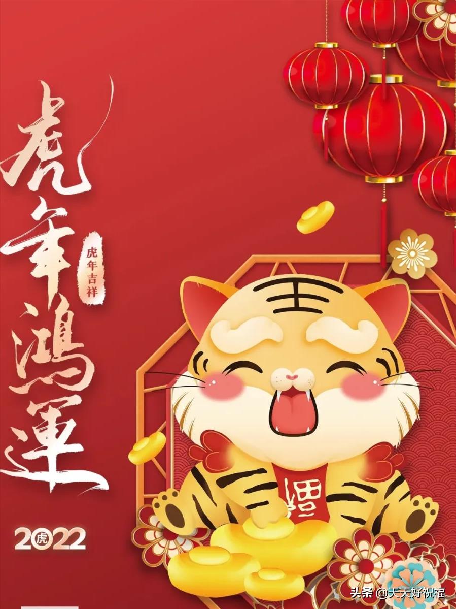 1、2022虎年快乐:祝你举头揽吉祥,低头抱如意,点头迎幸福,回头看美满,碰头遇贵人,摇头没烦恼,额头有祥光,眉头生瑞气,鼻头有福气,手头添财气!新年开头大吉大利!春节愉快!