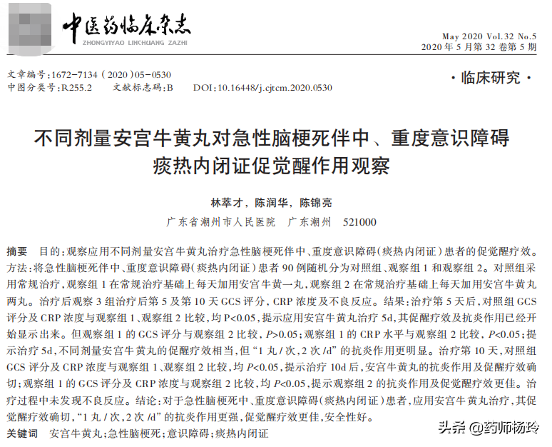 林萃才,陈润华,陈锦亮. 不同剂量安宫牛黄丸对急性脑梗死伴中、重度意识障碍痰热内闭证促觉醒作用观察[J]. 中医药临床杂志,2020,05:925-930.