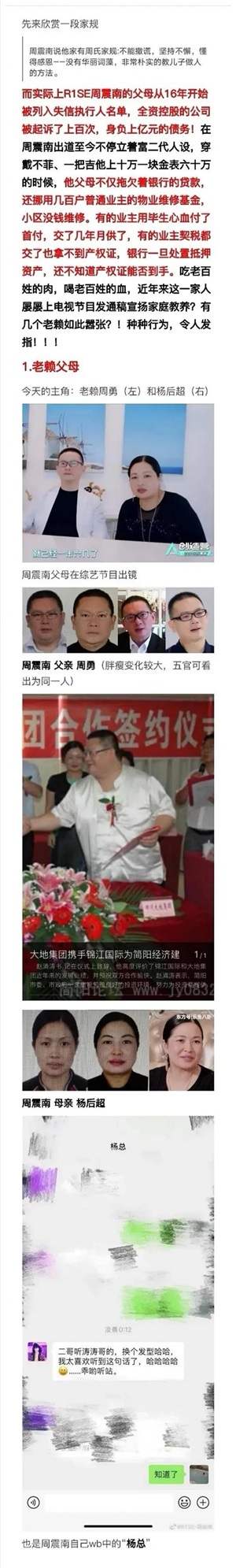 在参加《创造营》的2019年,彼时他的父母已经成为老赖欠钱不还,周震南还在节目中秀了自己家的大别墅。老赖家的别墅是这么豪华,再想到无数业主交了钱却没有产权证的悲惨境遇,不怪群众这么义愤填膺了!