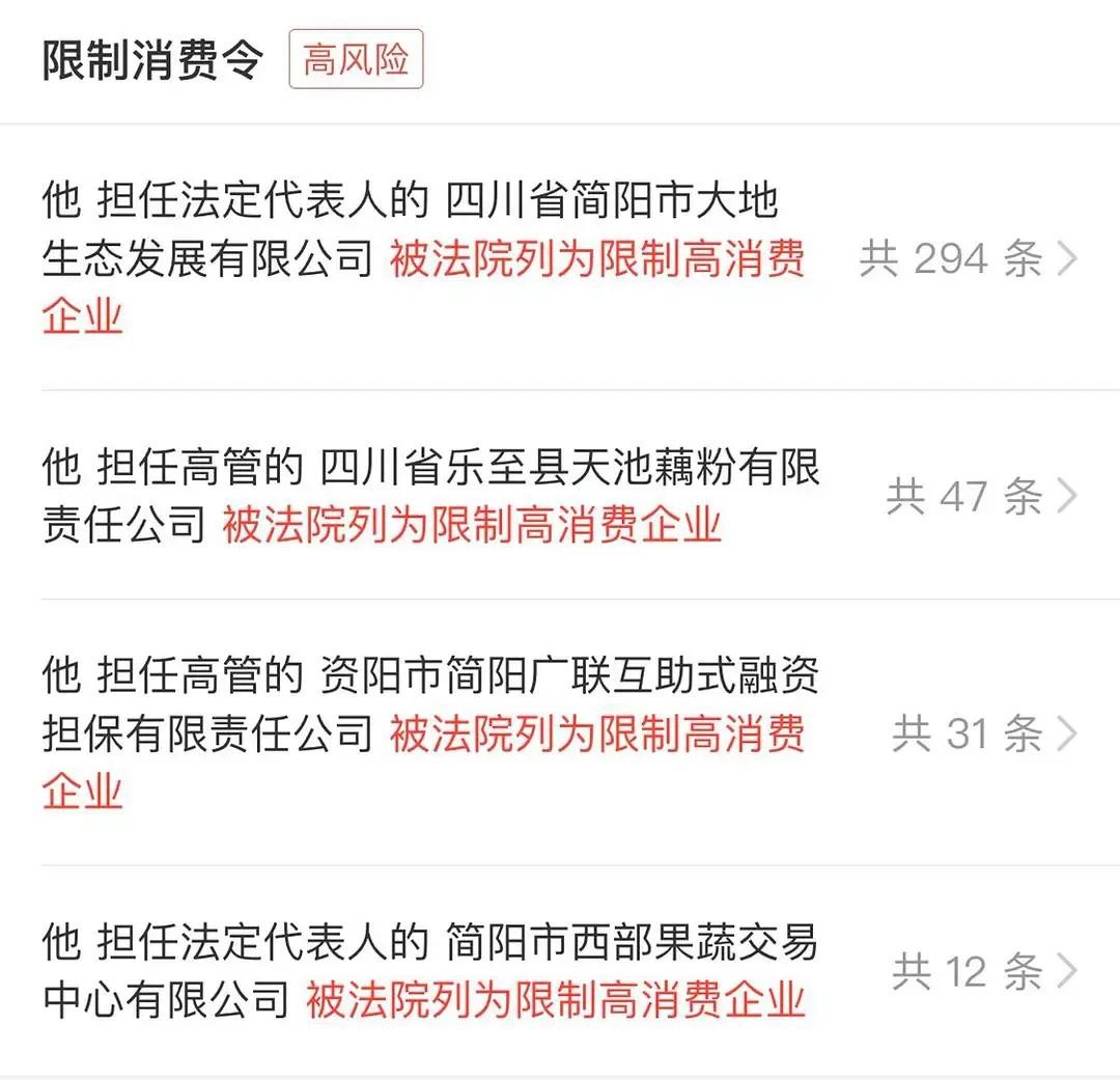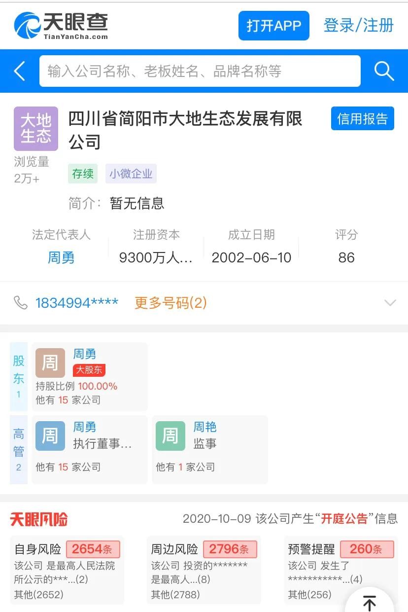 从“天眼查”中查到的信息可以看出,四川省简阳市大地生态发展有限公司的法人正是周震南的父亲周勇,且为周勇全资控股,该企业多次被列为限制高消费企业。周震南父亲周勇和母亲杨后超涉诉案件众多,累计金额超1亿多元,且全部未履行,被列为失信被执行人。失信被执行人,意即有能力还钱却拒绝还钱。