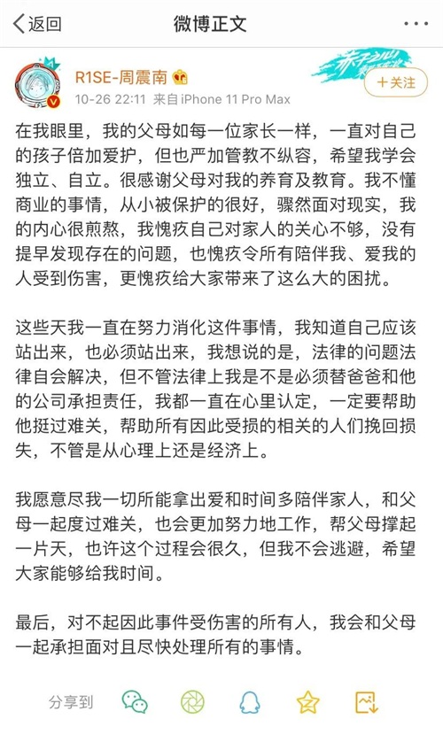 这件事情发酵之后,周震南终于“知道”了自己优渥的生活来自哪里,他在自己的微博上回应道: