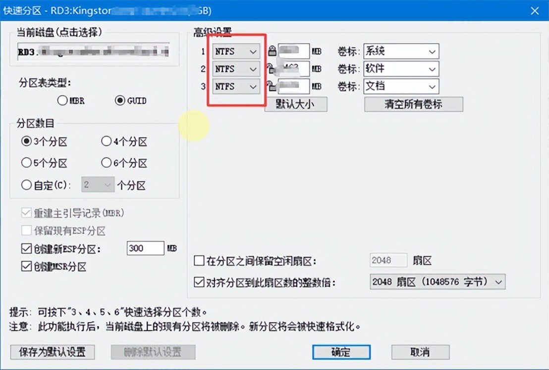 选中磁盘→快速分区→GUID(GPT)……