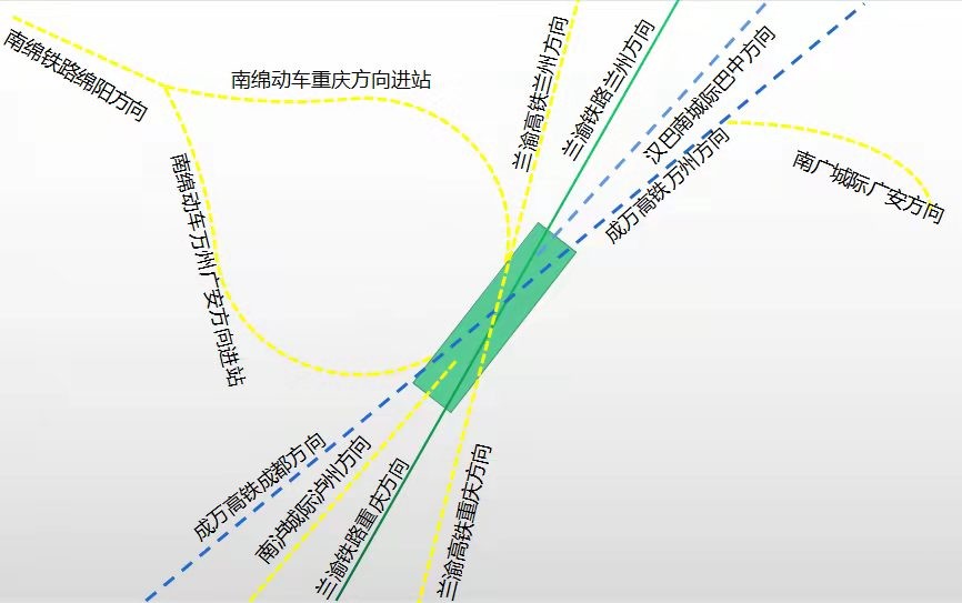 从上图中可以看到,南充北枢纽最终理想还是米字形高铁8个方向,依次为成都、泸州、重庆、广安、万州、巴中、兰州、绵阳。如果兰渝高铁场能在南充北新建,那么现在的兰渝场就主要分给汉巴南,南广,南泸等线路的动车停靠了。兰渝铁路未来以货运为主,渝新欧货运大通道,客运就去兰渝高铁了。