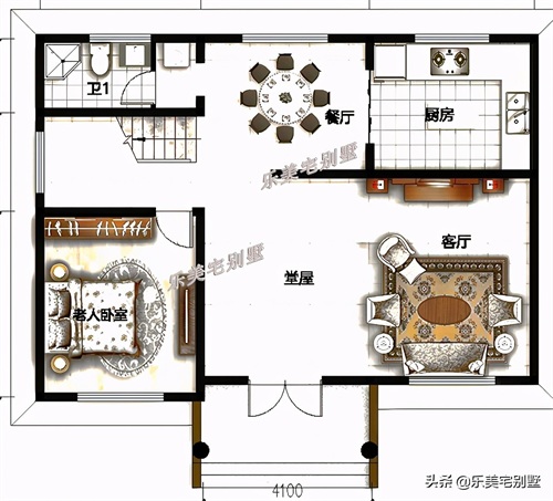 一层:堂屋、客厅、餐厅、厨房、老人房、卫生间