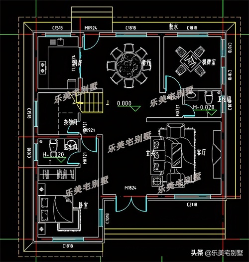 一层:玄关、客厅、厨房、餐厅、棋牌室、卧室(带内卫)、杂物间、卫生间