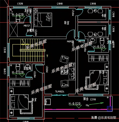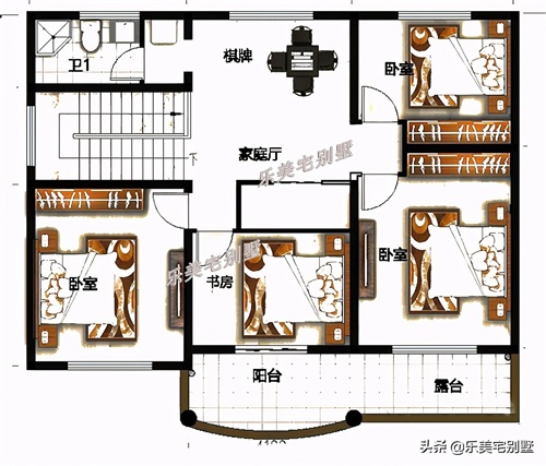 二层:家庭厅、棋牌室、3卧室、书房、阳台、露台、卫生间
