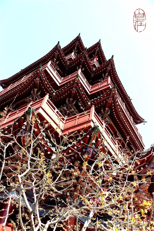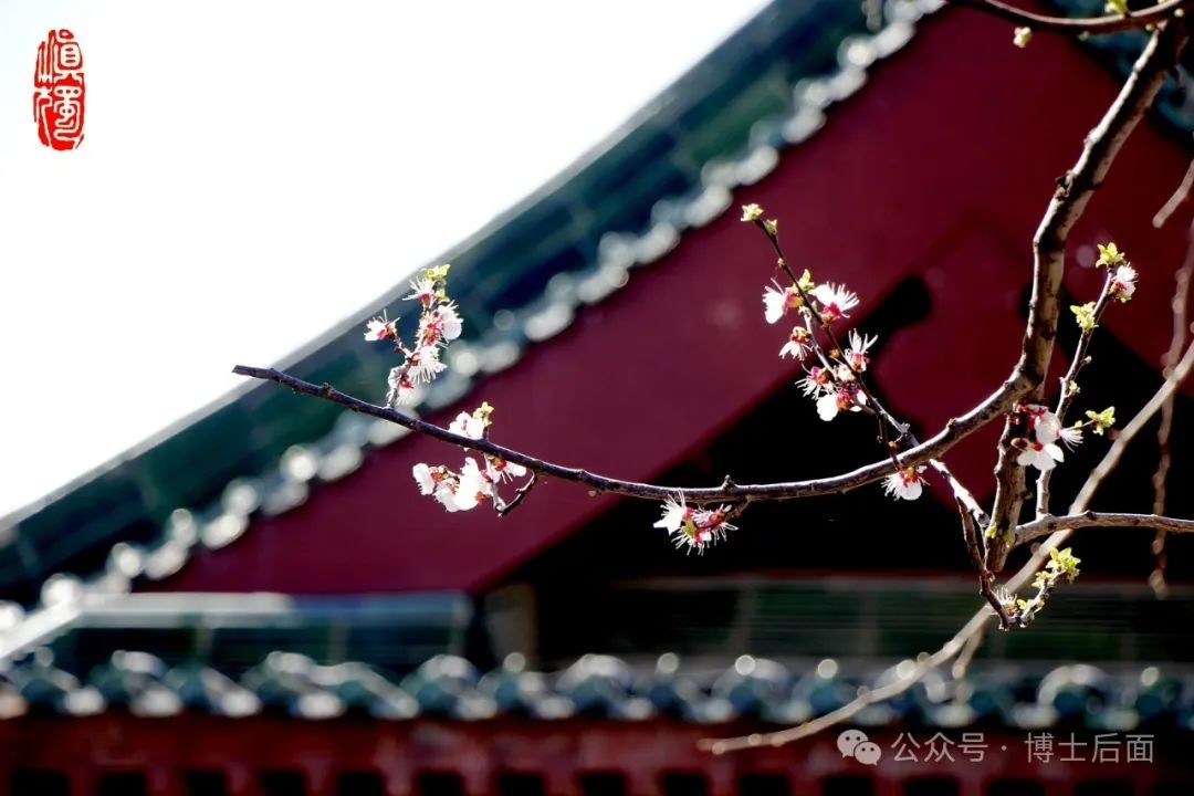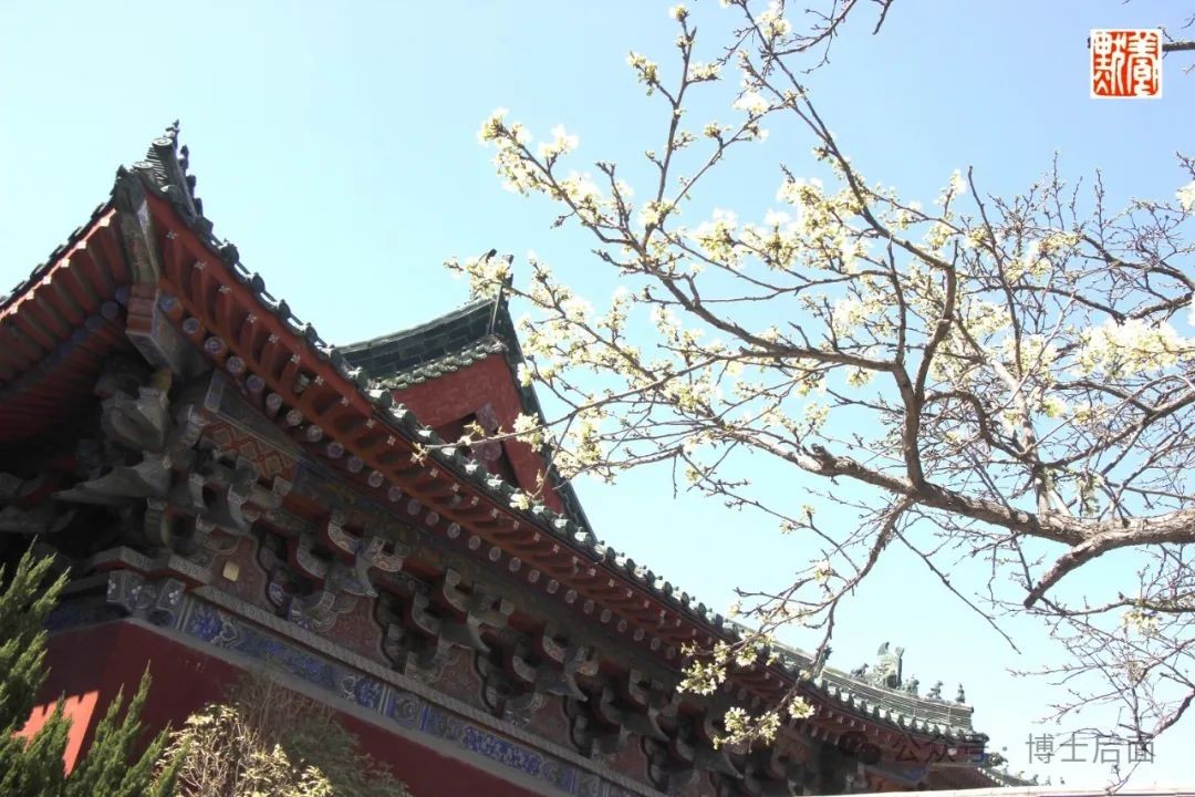 大堂侧隅,梨花怒放,琼蕊飘香,红墙肃穆,碧瓦庄严,飞檐翘角,好不气派。