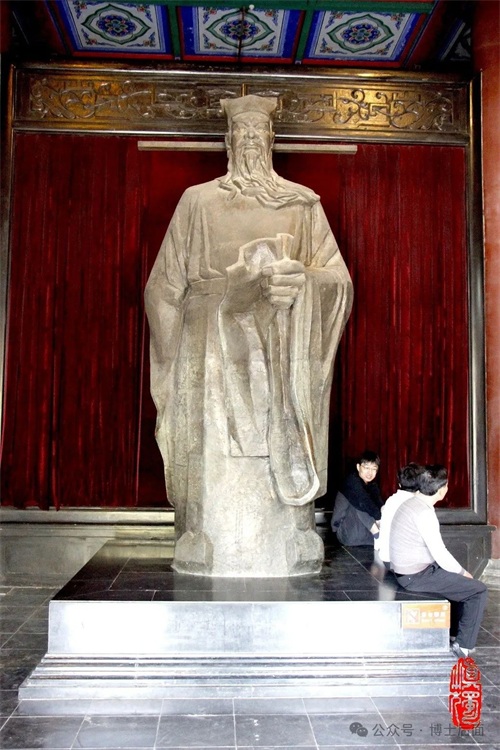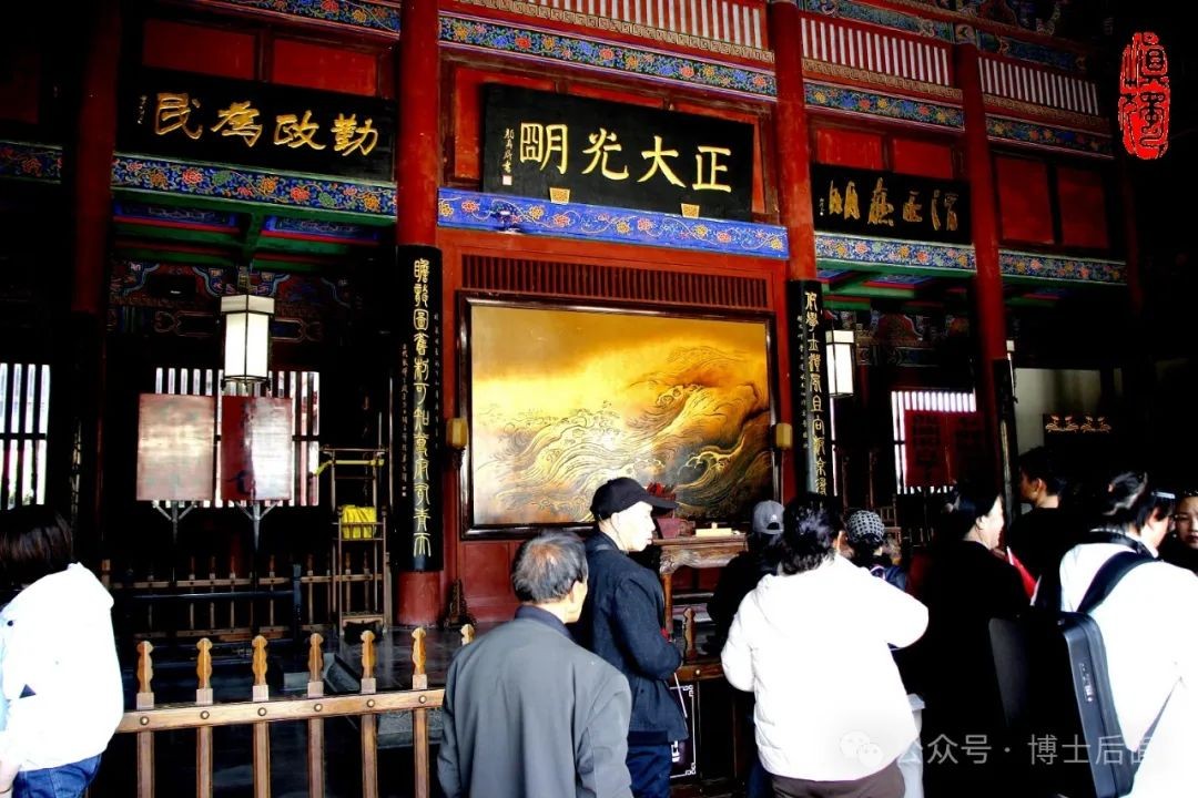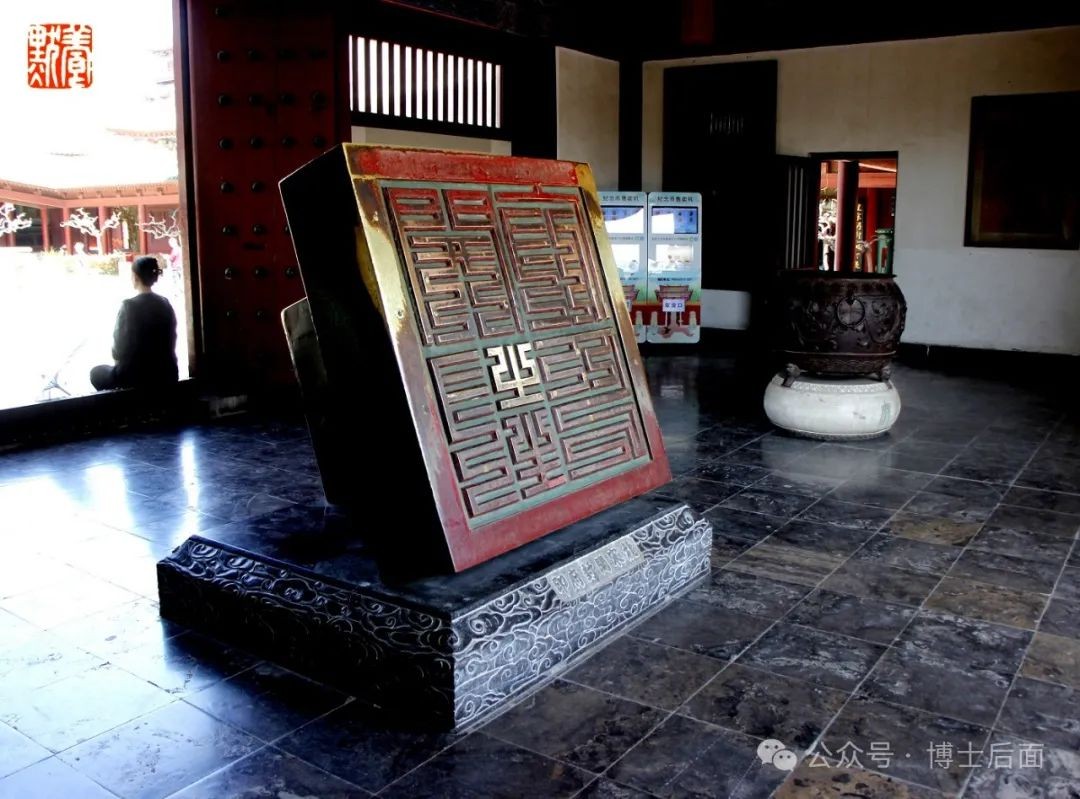 在东北角,是全府最高建筑“清心楼”,原本是观察整个京城火情的瞭望台,要求可避风雨,且要巍峨美观,于是建成阁楼式样。听说一楼大厅内立一尊铜铸包拯立像,号称全国最大,便赶过去礼拜一番。可当时那里却有几个游客坐在官袍之下歇脚,嬉戏说笑,基本无视我们几人的礼拜,确实有失对于包公的庄重,有伤公序良俗之大雅,况且出门不足十几米,红墙碧瓦之下,便是一长溜供游人歇脚的木质长椅。