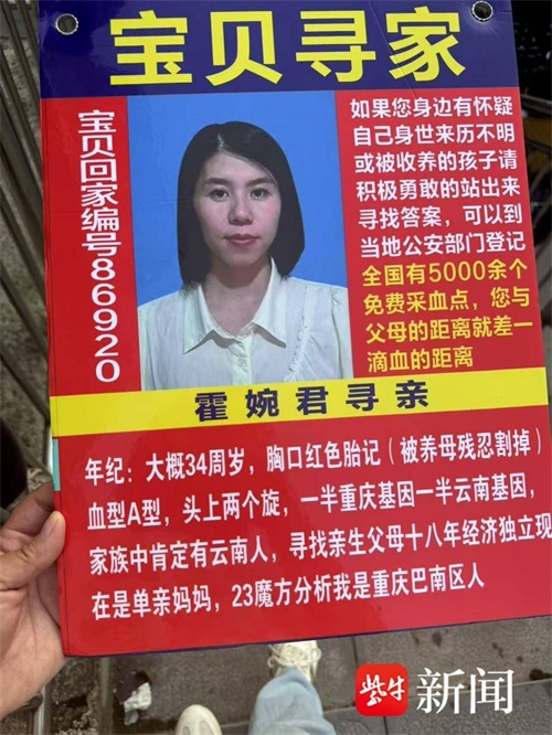 为了寻找亲生父母,霍婉君这些年来想尽了办法。2012年,她采血登记DNA信息。2014年,她在宝贝回家做了登记。