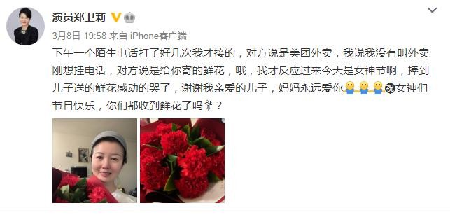 三八妇女节的时候,郑卫莉在社交平台晒自己亲生儿子送的花,看起来状态非常好!这或许就是她如今生活的动力吧!