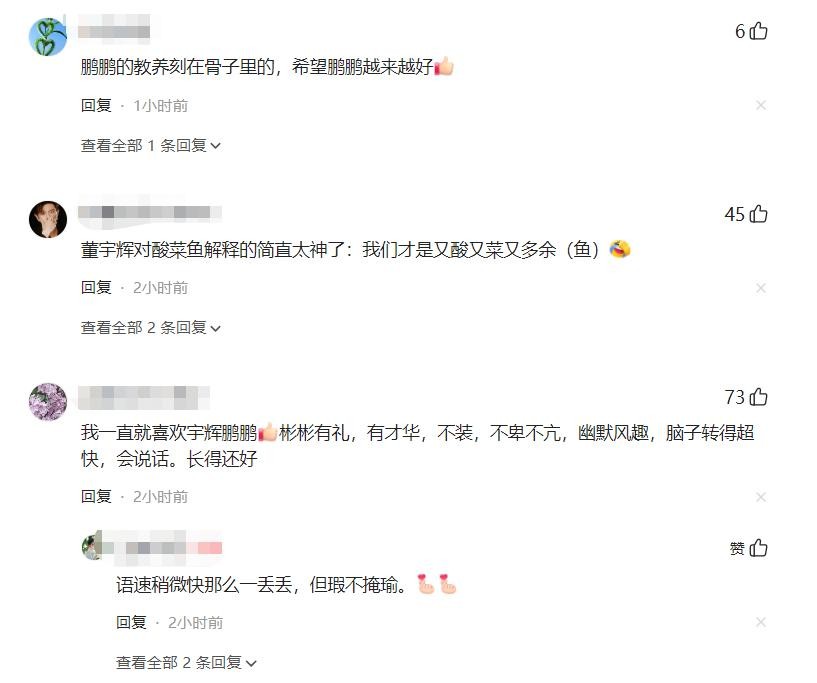 "从团队成员最不经意的小动作都能感受到对领导人的尊重,是因为整个团队文化就是这样的氛围吧!""在做人做事处处为领导人着想,这简直就是职场精神和修养的最佳诠释。"评论家们也纷纷表示赞赏,觉得这算是鹏鹏给董宇辉"长脸"的最佳方式了。