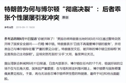很多人认为博尔顿之所以会被特朗普解雇,都是因为他的战争鹰派倾向,和他本人的乖张个性有关。