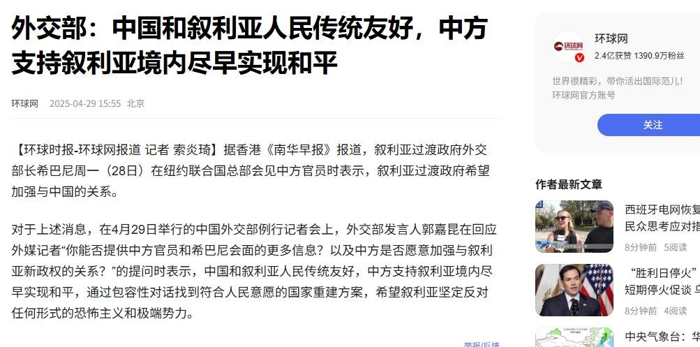 环球网 外交部:中国和叙利亚人民传统友好,中方支持叙利亚境内尽早实现和平2025-04-29