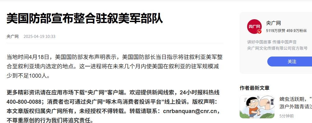 央广网 美国防部宣布整合驻叙美军部队2025-04-19