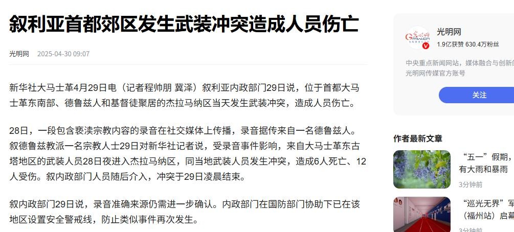 光明网 叙利亚首都郊区发生武装冲突造成人员伤亡2025-04-30