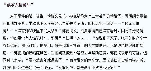 郭班主当时像开了新闻发布会,众多记者都领略到了郭式叙述法的威力。于是侯耀文千万遗产不翼而飞,人传人变成了共识。