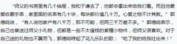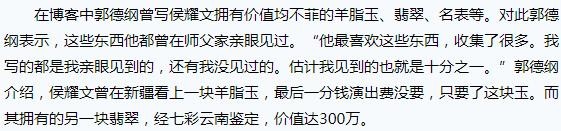 郭德纲采访中还提到侯耀文其他的收藏,玉石、翡翠,其实他还说到了红木家具、衣服等等。郭德纲当年拿这些东西说事,直接攻击侯耀华。