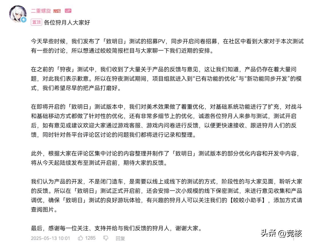 相较于玩法上的创新,《二重螺旋》的短板可能是首测表现出来的美术品质以及3C手感,距离头部产品还存在一定差距,官方也在6月测试的招募视频下着重提到了会在本次测试中提升美术品质、优化战斗手感。