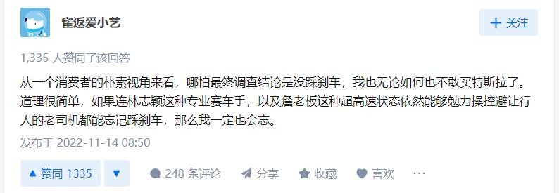 正如知乎一个高赞回复是这样说的:从一个消费者的朴素视角来看,哪怕最终调查结论是没踩刹车,我也无论如何不敢买特斯拉了,道理很简单,如果连林志颖这种专业赛车手以及詹老板这种超高速状态依然能够勉力操控避让行人的老司机都能忘记踩刹车,那么我也一定也会忘。
