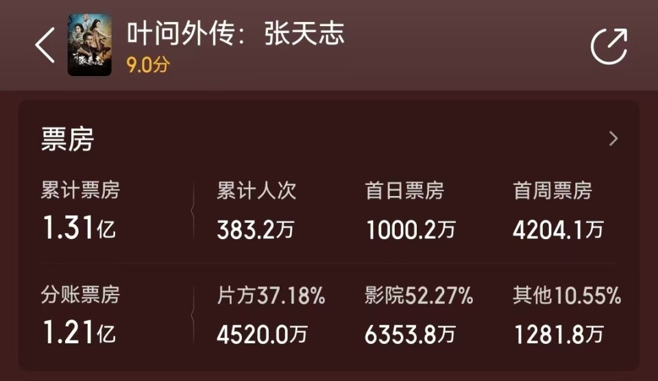 《叶问外传:张天志》的预算成本为5000万,最终内地票房拿到了1.31亿,加上海外版权收益,东方影业基本处于保本状态。