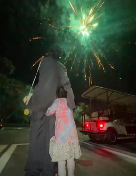 照片中是母女俩的背影,两人依偎在一起看烟花的场面温情满满。