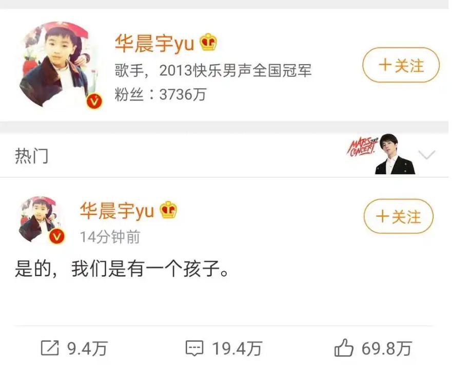 随后,华晨宇于社交平台径直发布了一条“是的,我们有个孩子”的文案,此消息一出,网友蜂拥而至,几近将服务器挤瘫痪。