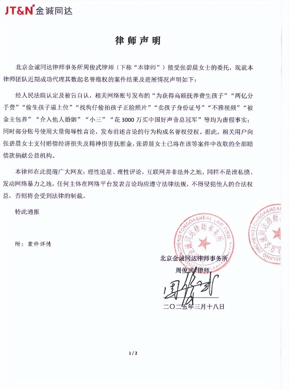 近日,张碧晨发布律师声明,公布名誉维权案件结果及进展情况。