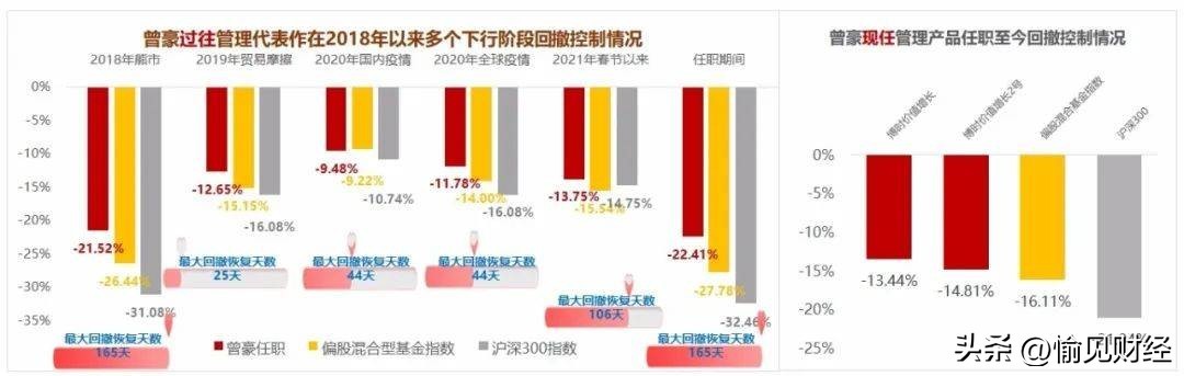 在2018年以来多个下行阶段,曾豪过往管理代表作回撤控制幅度均小于偏股混合型基金指数回撤幅度、小于沪深300指数回撤幅度。而且在2019年贸易摩擦期间,最大回撤恢复天数只有28天;在2020年国内疫情期间,最大回撤恢复天数只有44天。