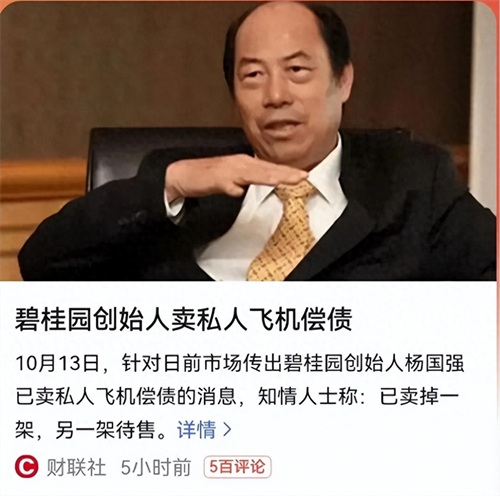 据报道,碧桂园创始人杨国强负债高达1.36万亿,并不得不出售自家私人飞机以偿还债务。已经有一架私人飞机成功售出,而另一架则已挂牌待售。