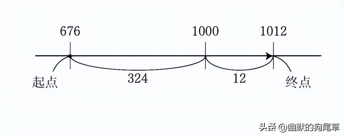 像这样,减法的概念和距离的概念就紧密结合在了一起。我们也可以将上图所示的676作为出发点(起点),将1012作为终点。