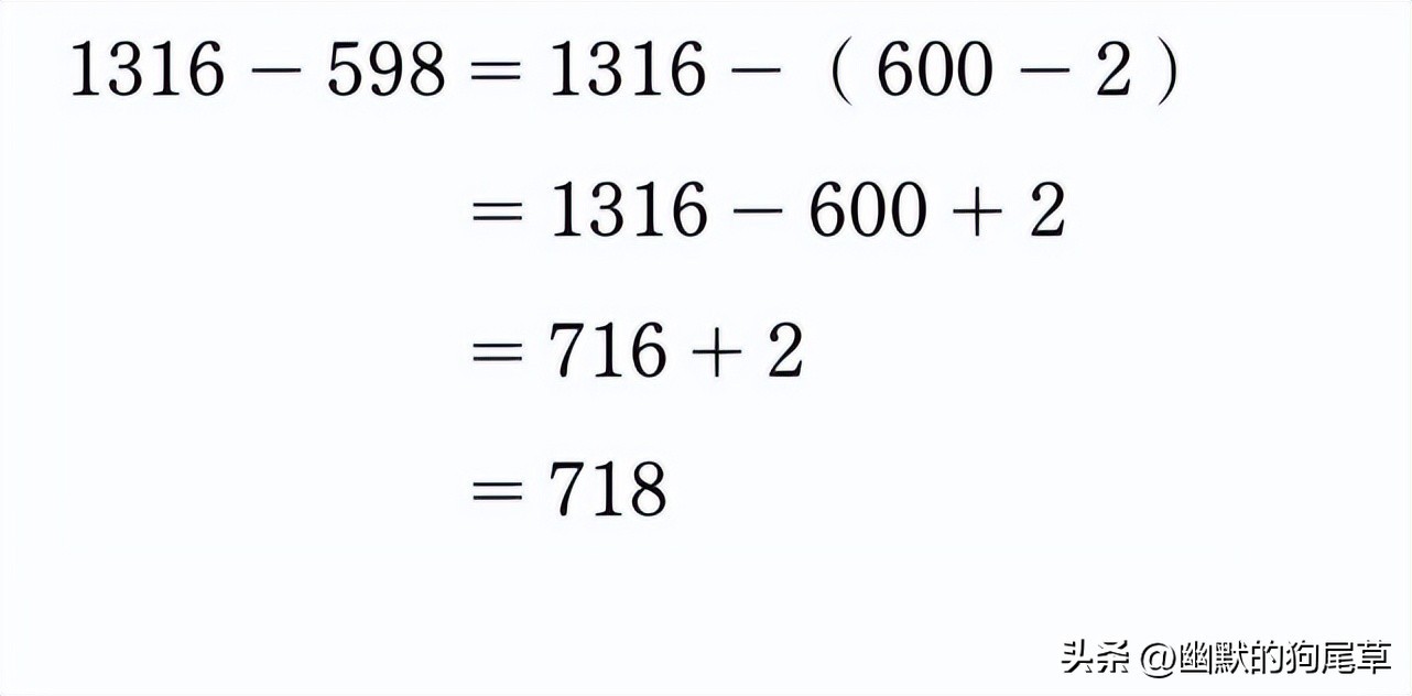故意多减:1316-600,一下子就得出716!但别急,这只是个中间步骤,因为我们多减了2。还回多减的数:把多减的2还回来,716+2=718!搞定!原题1316-598的答案就是718!