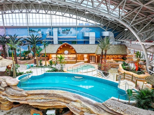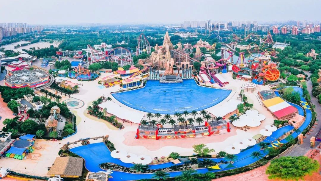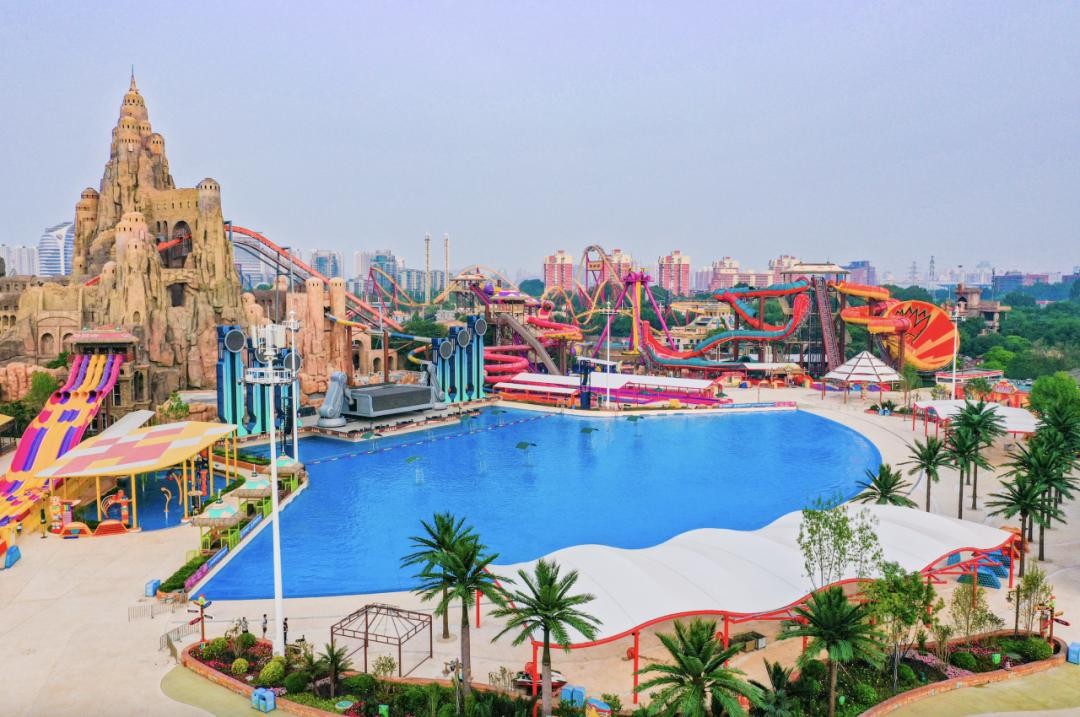 乐园最引人注目的当属华中地区规模最大的全天候恒温水乐园。总面积达2.8万平方米的水乐园分为室内外两大区域。室内水乐园占地9000平方米,恒温30℃的“热带雨林”环境让人仿佛置身异域海岛,茅草屋、椰子树与人工冲浪池等设施共同营造出浓郁的热带风情。室外水乐园则呈现大溪地特色,设有惊险刺激的“巨碗+巨蟒”滑道组合、长达207米的网红直滑激流河,以及专为儿童设计的戏水区,满足不同年龄段游客的玩水需求。