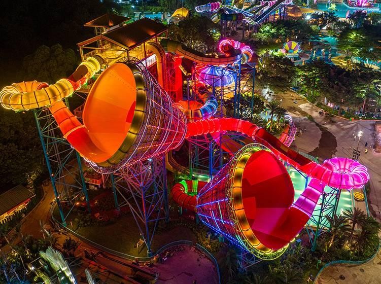 追求刺激的游客一定不能错过超级大喇叭、垂直滑道和水上暴风过山车等王牌项目;想要放松的游客则可以在漂流河缓缓而下,或是在儿童戏水区享受亲子时光。