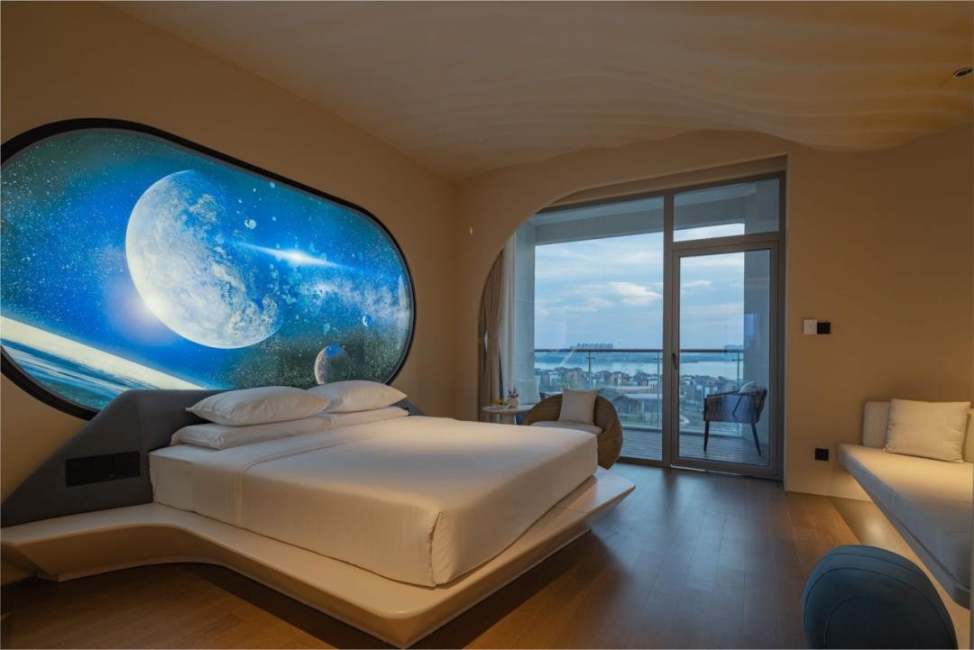 整个项目占地近12万平方米,从丛林树屋到湖畔船屋,每间客房都精心融入了乐园主题元素,让游客在舒适入住的同时尽览后官湖的绝美风光。园区还以IP形象“森森”和“BoBo”的探险故事为主线,打造了水乐园奇幻探索、儿童乐园星际征程、家庭游戏中心未来挑战以及知识森林自然奥秘等四大主题体验区。