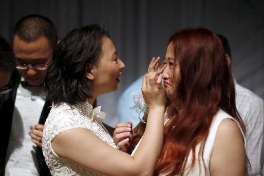 同性恋情侣徐娜(音)为恋人薛梦瑶(音)擦去泪水