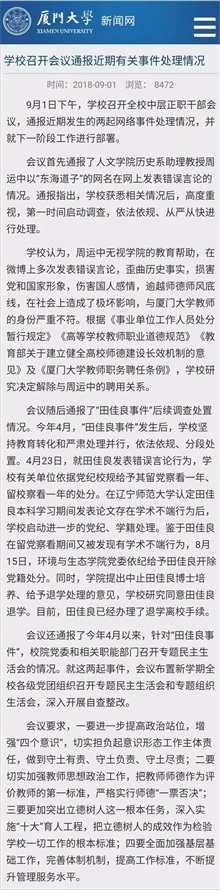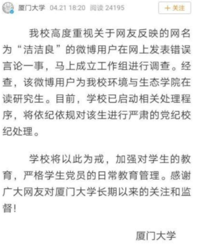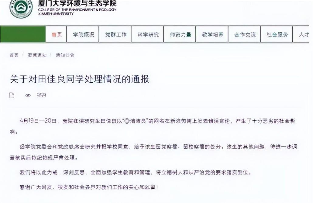 2018年4月23日,厦门大学环境与生态学院发布《关于对田佳良同学处理情况的通报》,通报表示,田佳良在网络上发表错误言论,产生了十分恶劣的社会影响。