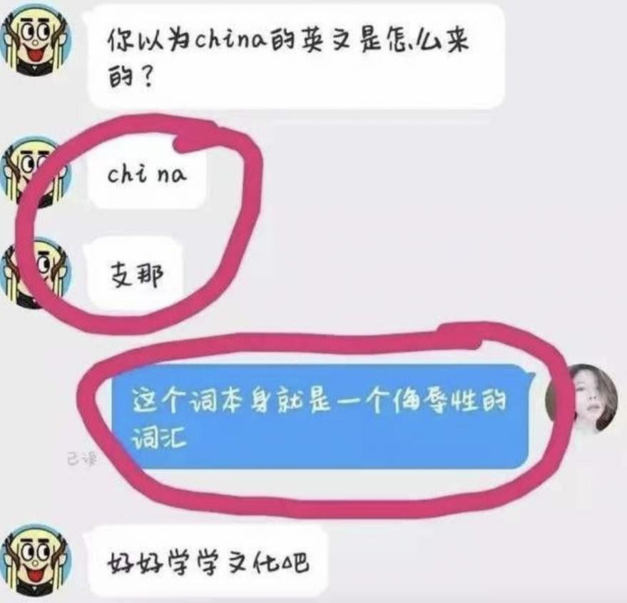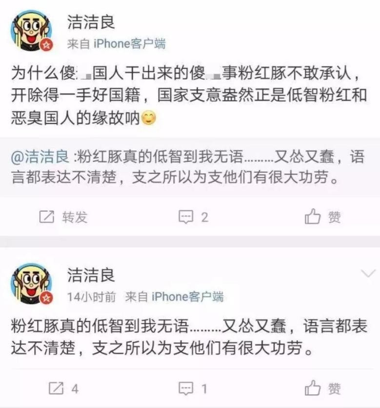而洁洁良发布的“恶臭你支”这四个字的意思,无异于在辱骂我们的国家。