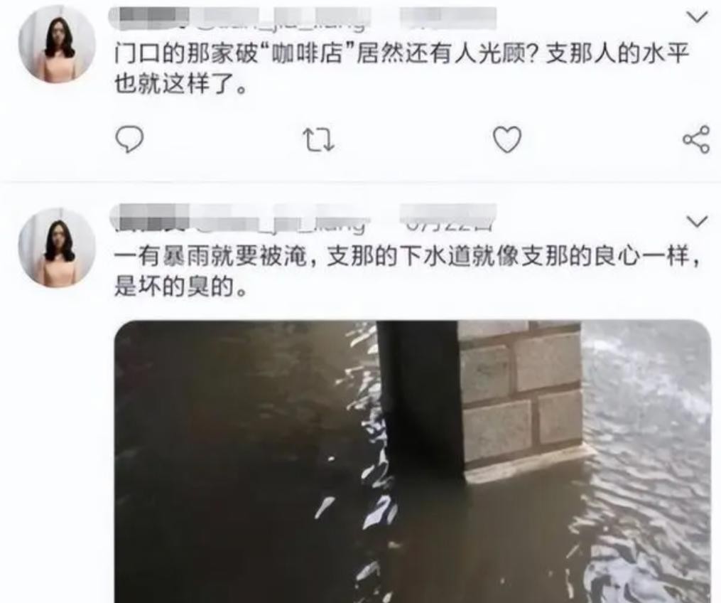 “门口的那家破“咖啡店"居然还有人光顾?支那人的水平也就这样了。”“一有买雨就要被沧,支那的下水道就像支那的良心一样,是坏的臭的。”