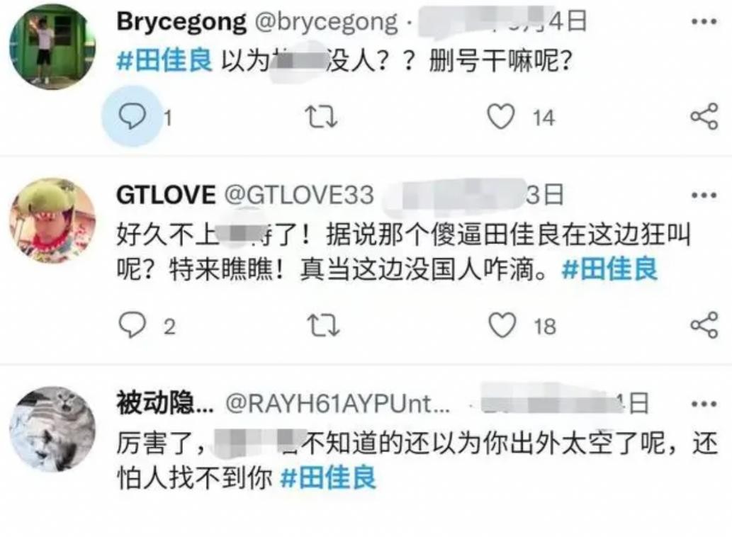 在推特中,田佳良比微博时期发表言论更加猖狂和令人憎恶,例如: