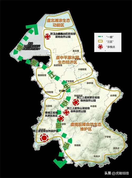 三区:虞北滩涂生态功能区、虞中平原水网生态经济区、虞南丘陵自然生态维护区。