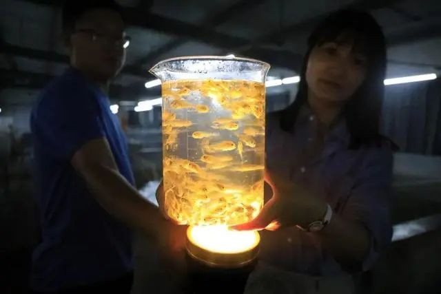 舟山市水产研究所岱衢族大黄鱼苗车间,工作人员正展示进入野化训练环节的大黄鱼苗
