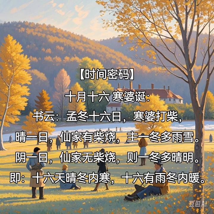 ·【时间密码】十月十六寒婆诞:书云:孟冬十六日,寒婆打柴晴一日,仙家有柴烧,主一冬多雨雪。阴一日,仙家无柴烧,则一冬多晴明。即:十六天晴冬内寒,十六有雨冬内暖。万物遇木气则生,遇金气则谢;木气主生主合、金气主谢主离;故四季中所有寅卯日,均为合日;四季中所有申酉日,均为离日;甲寅乙卯天地合,甲申乙酉天地离;今日甲申、明日乙酉,四季之离日;天地之气相离之日,天地应季之水气不合,则冬寒之气无以成。