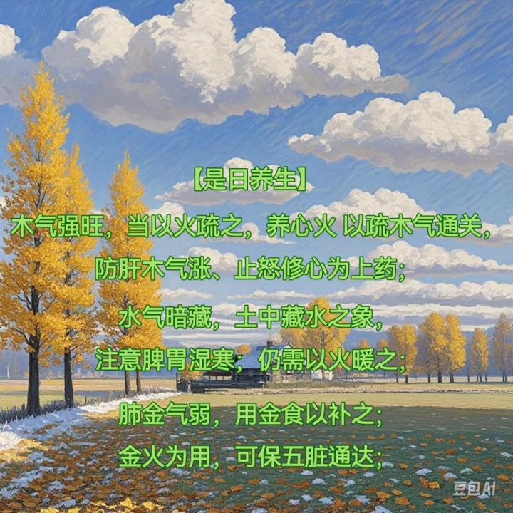 ·【是日养生】木气强旺,当以火疏之,养心火以疏木气通关,防肝木气涨、止怒修心为上药。水气暗藏,土中藏水之象,注意脾胃湿寒;仍需以火暖之。肺金气弱,用金食以补之。金火为用,可保五脏通达。