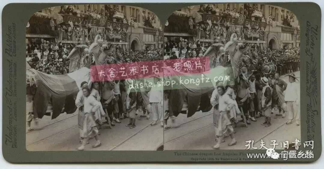 清末立体照片,1903年美国洛杉矶华侨“胜昌”舞龙队花车巡游。