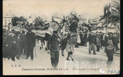 1906年,法国马赛博览会中国舞龙游行明信片、贴外国邮票二枚、销外国戳。